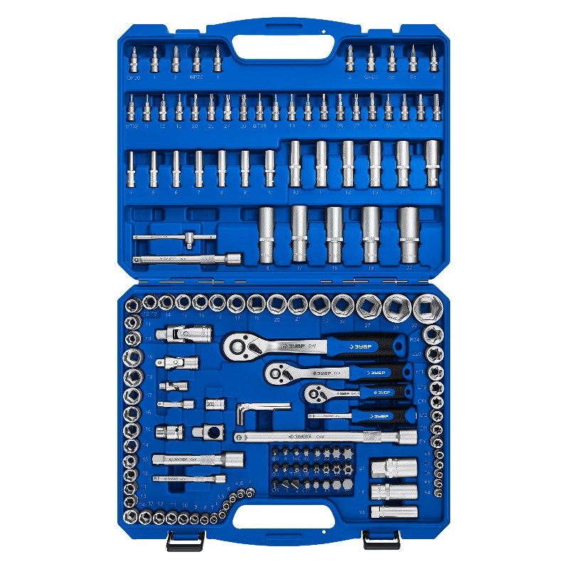Набор инструмента универсальный ЗУБР А-151 (151 предм., 1/2″+3/8″+1/4″) предназначен для монтажа и демонтажа резьбовых соединений при ремонте автомобилей и других изделий.