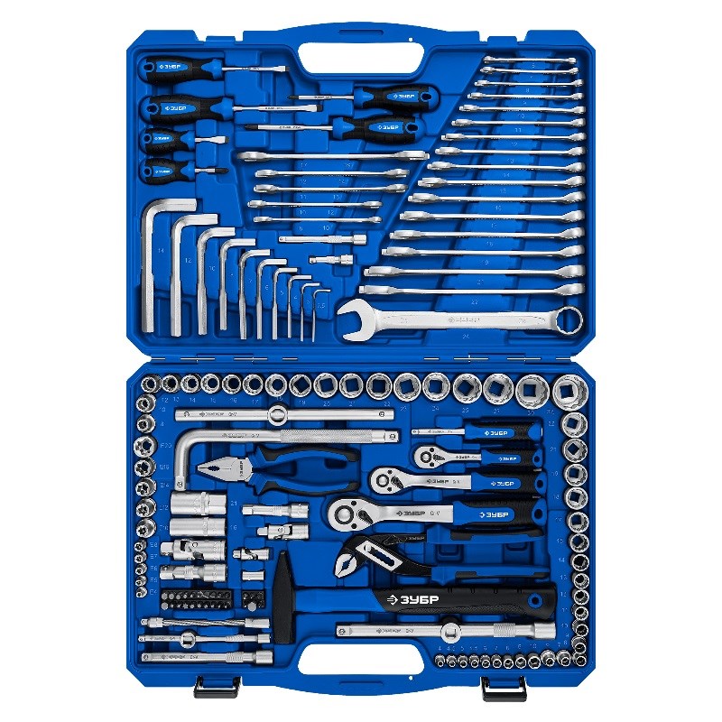 Набор инструмента универсальный ЗУБР Универсал-142 (142 предм., 1/2″+3/8″+1/4″) предназначен для выполнения слесарных, монтажных и ремонтных работ с крепежом.